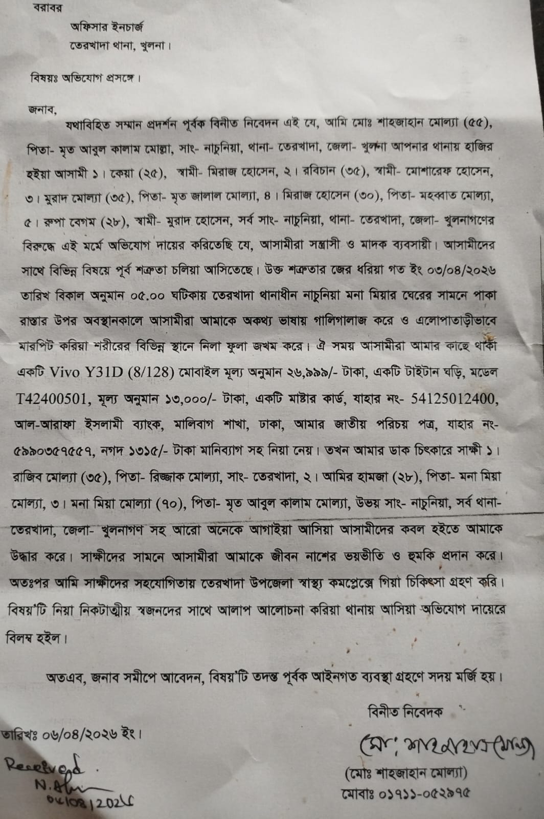 তেরখাদায় সাংবাদিক ও কৃষি উদ্যোক্তার ওপর হামলা-ছিনতাই, থানায় অভিযোগ